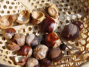 | (奥さん) とちの実のあく抜きだけはね、昔からの方法じゃないとできないんですよ。昔の人はえらいね、これをあく抜きしたら食べられるゆうことをみつけたんやね。昔はね、お正月と寒しかできなかったんですよ。お正月に作って、いいのができたら京都や大津の親戚にもっていく。それで、とちもちやなくて、「やりもち」とかいうてたんです。今は、夏、冬問わず、1年中作ってますけどね。 (山本さん) とちの木は2mぐらいの大木になると、木の下へ行ったら何か神秘的な感じがする。雨の日なんか巨木の下に行ったら、薄暗いし大蛇が出てくるような、何かが自分にせまってくるような恐ろしいような感じがするんや。 |