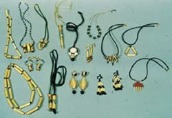●アクセサリー 高品質のヨシの端材を活用するデザイン。端を焦がし、その色をアクセントにしている。ヨシの色艶を活かしてビーズ、木、皮紐、石など他の素材を組み合わせて様々なデザインが展開できることが確かめられた。 |