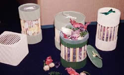 | ●パッケージ 段ボールの側面の孔に細いヨシを差し込み、ヨシの隙間を活かしたデザイン。キャンディのパッケージなど様々な応用が考えられる。段ボールとヨシの組み合わせは、パッケージのほかにも発展性がある。 |