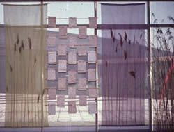 | 金氏さんの論文『葦のデザイン』を今週も紹介します。 <現在までに提案してきた主なデザイン(続き)> ●タピストリー 透ける素材に穂付きのヨシを縫い込んだデザイン。およびヨシとヨシ紙を組み合わせたユニットを連続させたタピストリー。ヨシを布や和紙と組み合わせてモダンな和風のイメージにしている。 |