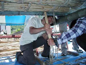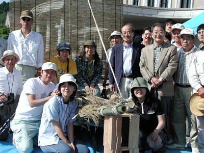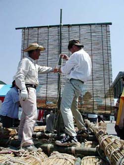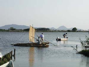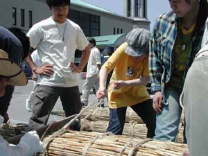 ヨシ舟が船出しました 本日はまことに楽しい日でありました。安土町の信長祭りの商工会ブースの一つを東近江水環境自治協議会に割り当てていただき、そこでヨシ舟の試作を行ったのです。安土の西の湖畔に立てかけておいた竹田さんのヨシを使ってしまうと、ヨシ舟造りの看板のところのヨシが無くなってカッコが悪いと急遽、昨日円山の西川先生に無理を言って貰い受けたヨシを使い、朝9時過ぎから午後3時頃までかかって我が会第一号のヨシ舟が完成したのです。デジカメでその勇姿をご紹介できぬのがはなはだ残念でありますが腰がバンと張り、安定型の後ろ美人で、ほのかに色香漂うなかなかのものでありました。 商売道具の重機や道具で、かさばって扱いにくいヨシを巧みに丸め込んでいただいた重野さんを中心に、奥田、安居、竹田、堤の皆さん、嵯峨芸術大学、滋賀県立大学の若者達、びわこ市民研究所の米原さんと和田さん、新聞見て駆けつけてくださった地元の人達に加えて、安土町生活環境課有志の皆さんなどの手によって、舟はたいそう上手に出来あがりました。 大阪から舟運フェァにわれわれ同様ヨシ舟で参加したいと西川先生のところに訪れてこられたエコロジーネットワークOSAKA(ENO)の8人のメンバーも見に来ていただきました。 出来あがったらすぐ浮かべてみないと気の済まないガキ魂を何才になっても忘れる事の出来ない人の集まりです。アッというまにトラックに舟を載せ途中で進水式のシャンペンを買い、新聞社に電話して進水式をやるからおいでと出たとこ勝負で手際良くやるという我が会の伝統に即したアクションの結果、ヨシ舟は西の湖に浸水する事も無く進水いたしました。 浮いたら乗れやとなるのが世の習い、オッチョコチョイの私めと、彦兵衛の二人が乗船しました。折りからの心地よい北風を葦簾の帆が受けてスムーズに船出したのです。 あとどうなったか?それは誰かに聞いてください。 |