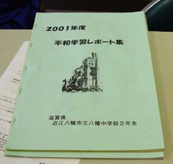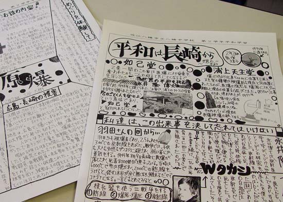 | なんか、子どもたちが自主的に楽しそうに取り組んでいる感じがでていますね。 「被爆体験の方のいろんなお話の中で、平和祈念像というのがありますが。ぼくらは平和祈念像が平和の象徴だと思っていたんですが、被爆体験の方にとっては、ああいう箱ものや像を用意するのではなく、それやったら、被爆にあわれた方のことをもっと考えるとか、モニュメントなんかじゃなく中身を大切にしてほしいという思いが伝わってきました。」 |