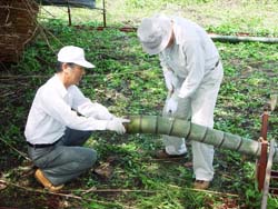 | ヨシ舟づくりでは大活躍の重野さんも余裕。だけど、ヨシ舟づくりも3回目になるのに、なんでこんなに、みんなうれしそうなんでしょうね。 | |||||||||||
