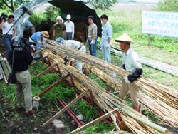 | 7月20日(土)に西の湖で3回目となるヨシ舟の試作が行われました。 じっとしてても汗が吹きだす暑い日にもかかわらず、約40名のヨシ好きが集まりました。 |