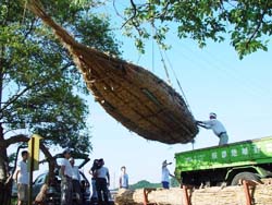 | やっぱりでかい!!ゆうに10mをこえる巨体を、「今日はやらない」といっていたテスト航行をするためにトラックに乗せる、顔のゆるんだ大人たち。 | |||||||||||